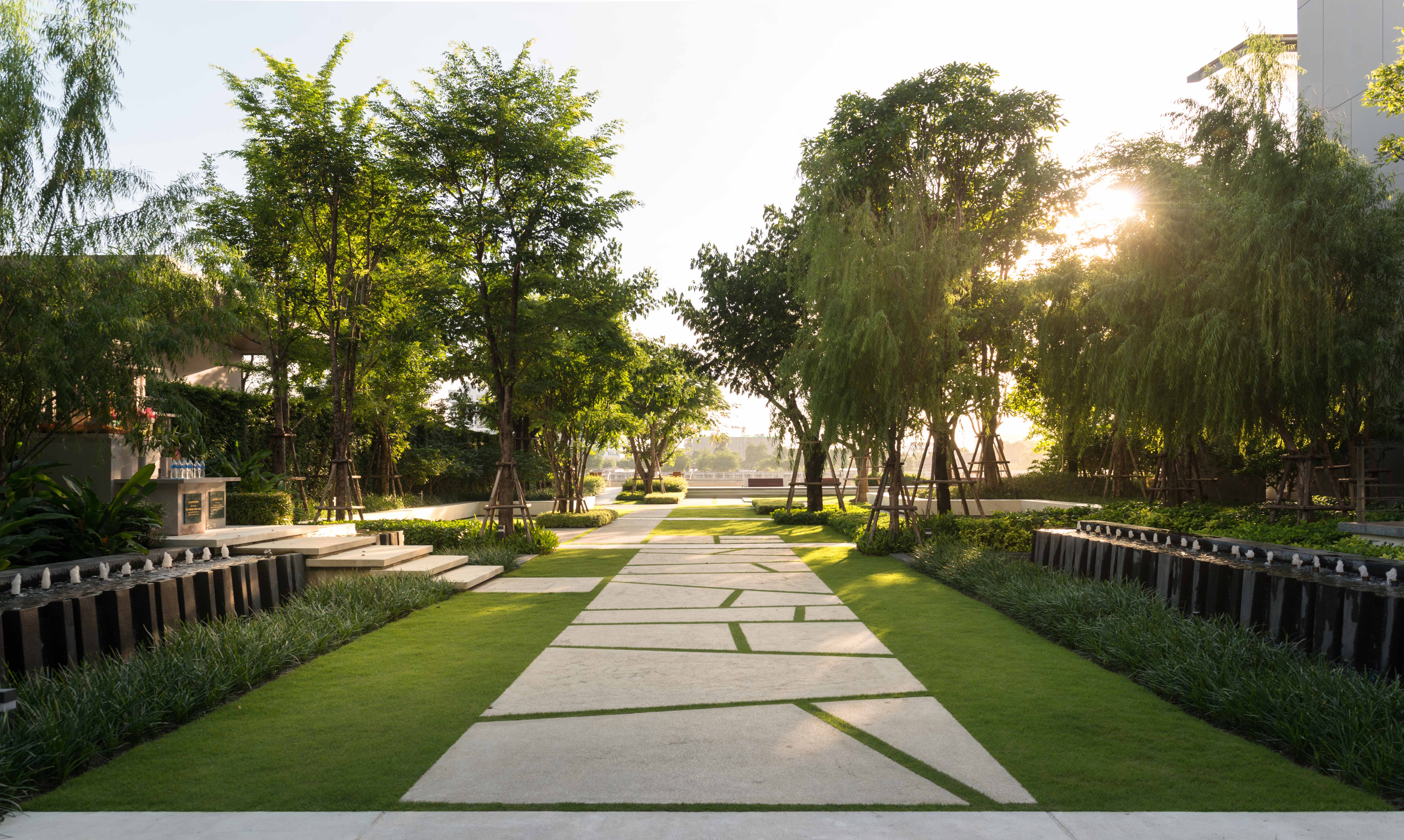 through the covered canopy of Rain Tree corridor focusing into the project and